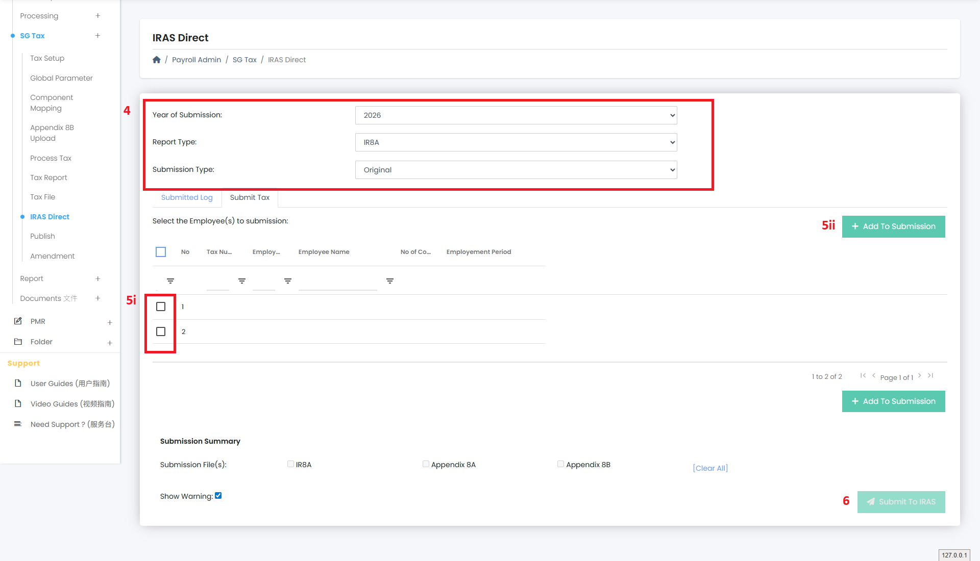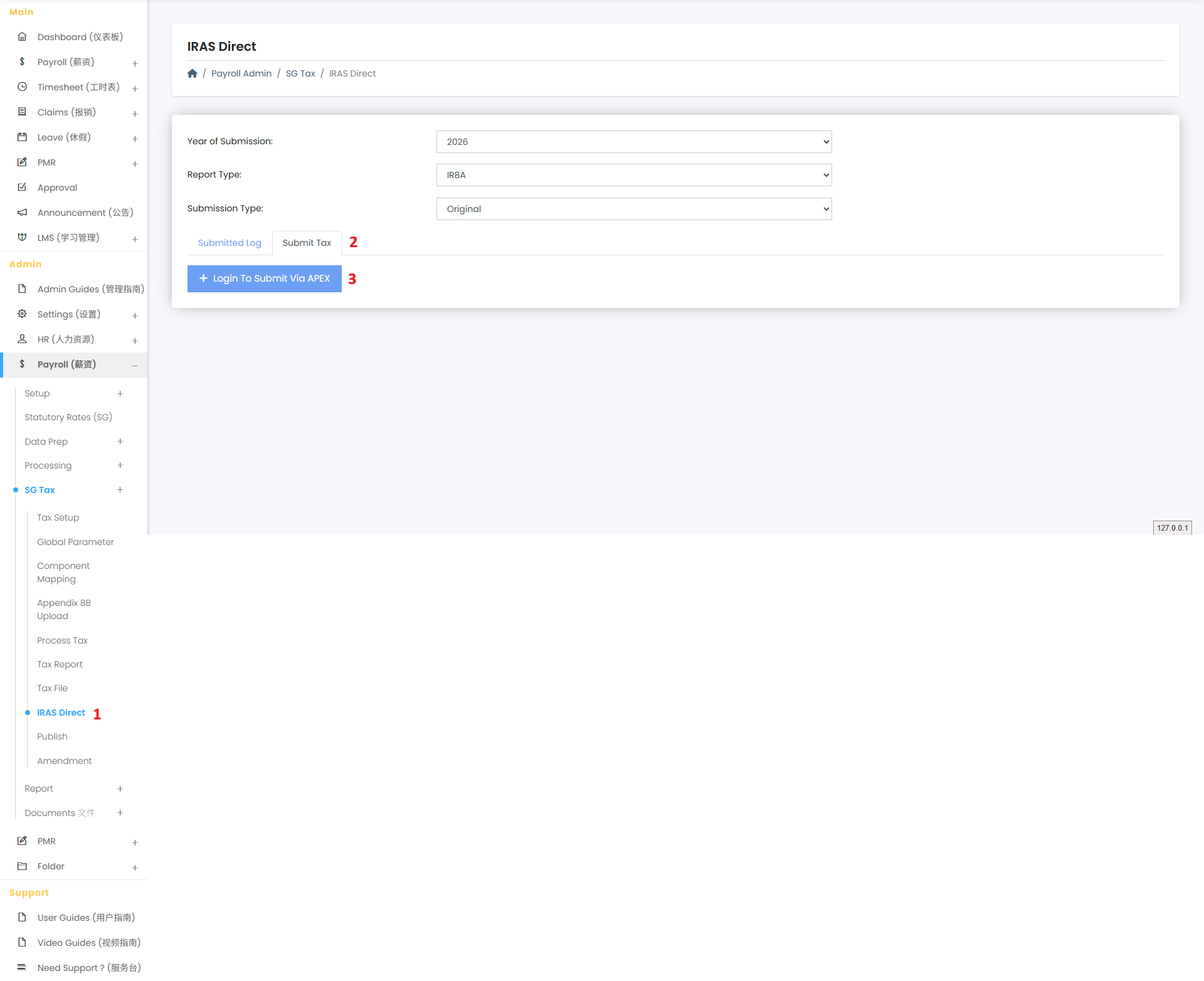 - Go to Payroll >> SG Tax >> IRAS Direct.